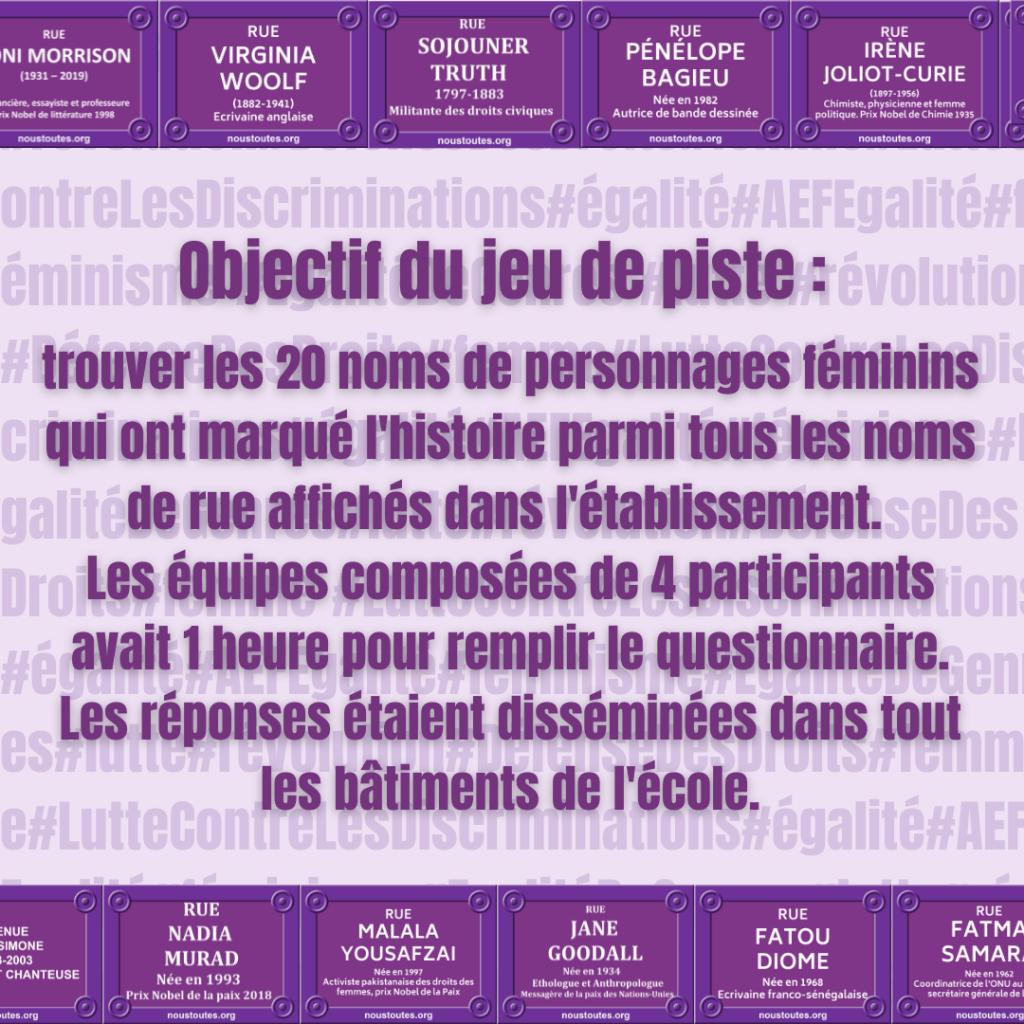 Découvrez les actions menées du 7 au 11 mars 2022 par les membres du club XY égalité à l’occasion de la journée internationale de de défense des droits des femmes.